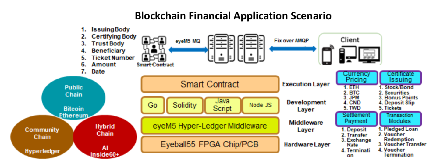 Referring to the diagram below, eyeball FinTech has finished developing eyeM5 Hyperledger middleware so that the client as the beneficiary can interact with various financial entities for contract status checking and making transaction through cross chain smart contracts. The solution developers ofdigital currency smart contract can use the AI inside60+ Smart Contract Development Platform to work on currency issuing, payment, settlement, etc. financial operations covered in the smart contract.